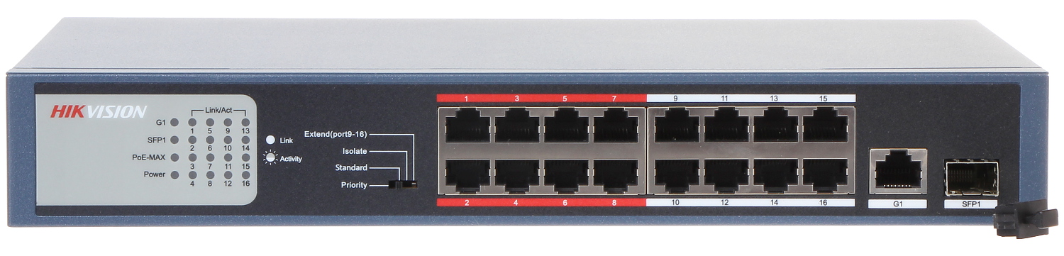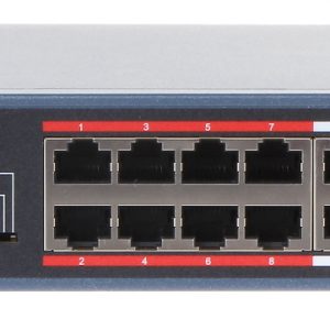 Porty LAN: 16 x RJ45 10/100 Base-TX ( 16 x PoE (802.3af/at) ), 1 x port SFP – Uplink, 1 x RJ45 – Uplink ; Szybkość transmisji: 10 / 100 Mb/s – 16 Portów LAN & PoE, 10 / 100 / 1000 Mb/s – 2 Porty Uplink ; Maksymalna moc wyjściowa: 30 W / port PoE ; Tablica adresów MAC: 4k ;