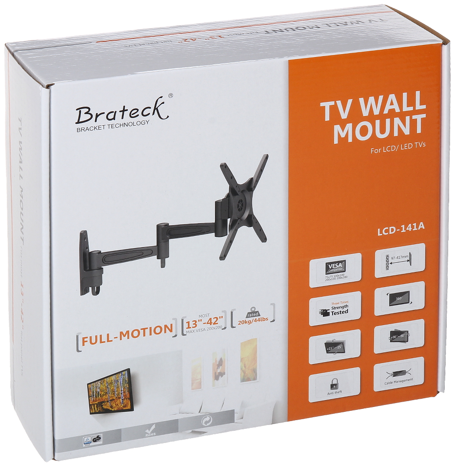 Rozmiar TV w calach: 23 ” … 42 ” ; Nośność: 35 kg ; Dystans od powierzchni montażu: 45 … 508 mm ;