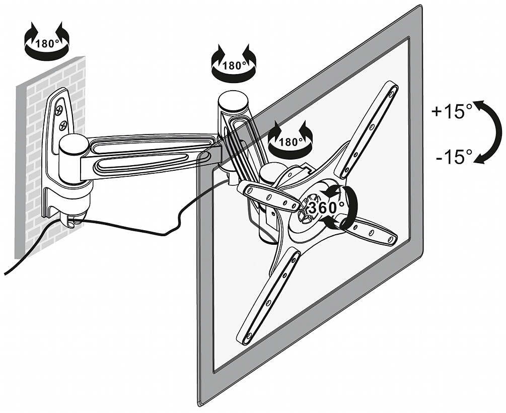 Rozmiar TV w calach: 23 ” … 70 ” ; Nośność: 50 kg ; Dystans od powierzchni montażu: 100 … 440 mm ; Pochylenie w pionie: 0 ° … 15 ° ; Obrót w poziomie: -45 ° … 45 ° ;