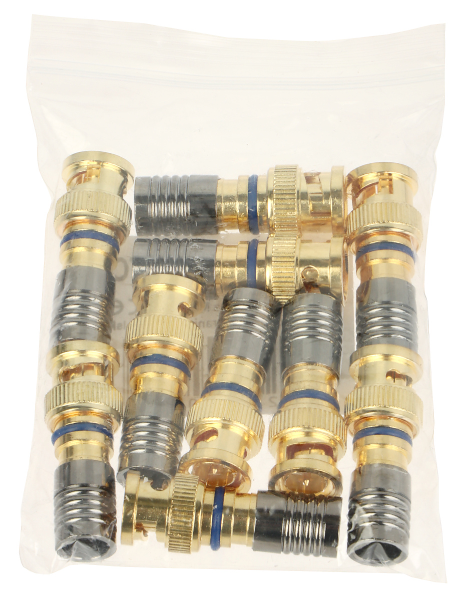 W opakowaniu: 10 szt. Podana cena za opakowanie ; Rodzaj złącza: BNC Wtyk ; Mocowanie elementów złącza: Mocowanie kompresyjne ; Przeznaczenie: Kabel koncentryczny ; Średnica kabla: max. 8.1 mm ; Przykładowe zastosowanie: RG-6 HFEK Triset-113 ;