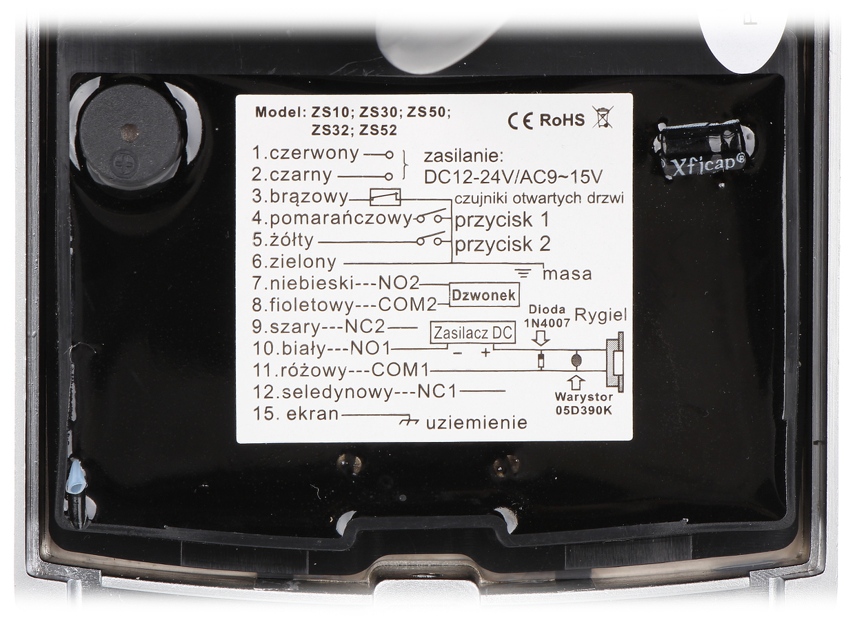 Obciążalność styków przekaźnika: max. 2 A ; Wybrane funkcje: przekaźnik do sterowania elektrozaczepem, ryglem lub blokadą elektromagnetyczną Zielone podświetlenie przycisków ;
