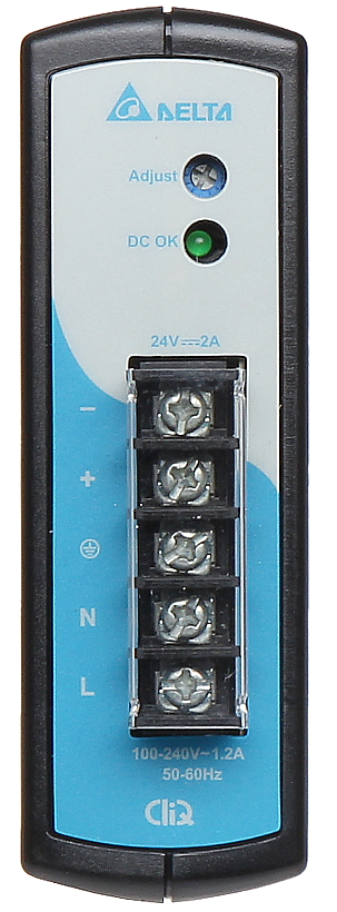Napięcie wyjściowe: 24 V DC ; Regulacja napięcia wyjściowego: 22 … 26 V ; Wydajność prądowa zasilacza: 2 A ; Moc zasilacza: 48 W ;