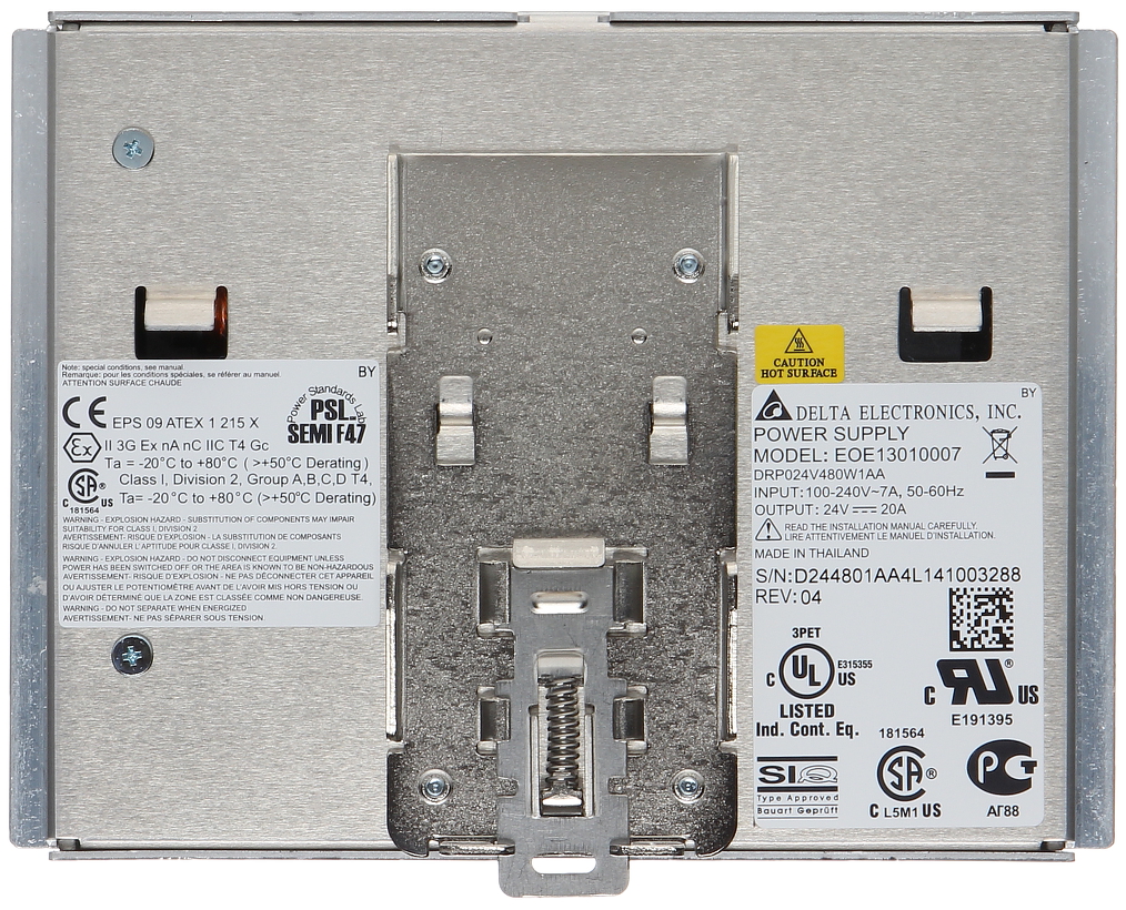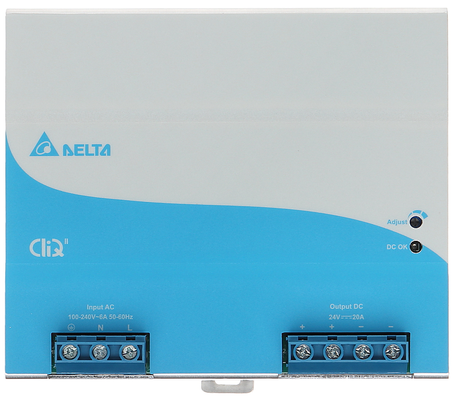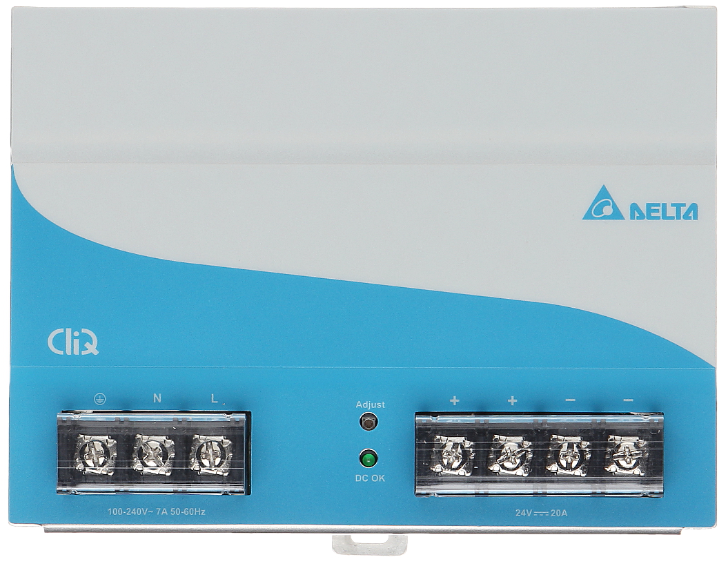 Napięcie wyjściowe: 24 V DC ; Regulacja napięcia wyjściowego: 22 … 28 V ; Wydajność prądowa zasilacza: 20 A ; Moc zasilacza: 480 W ;