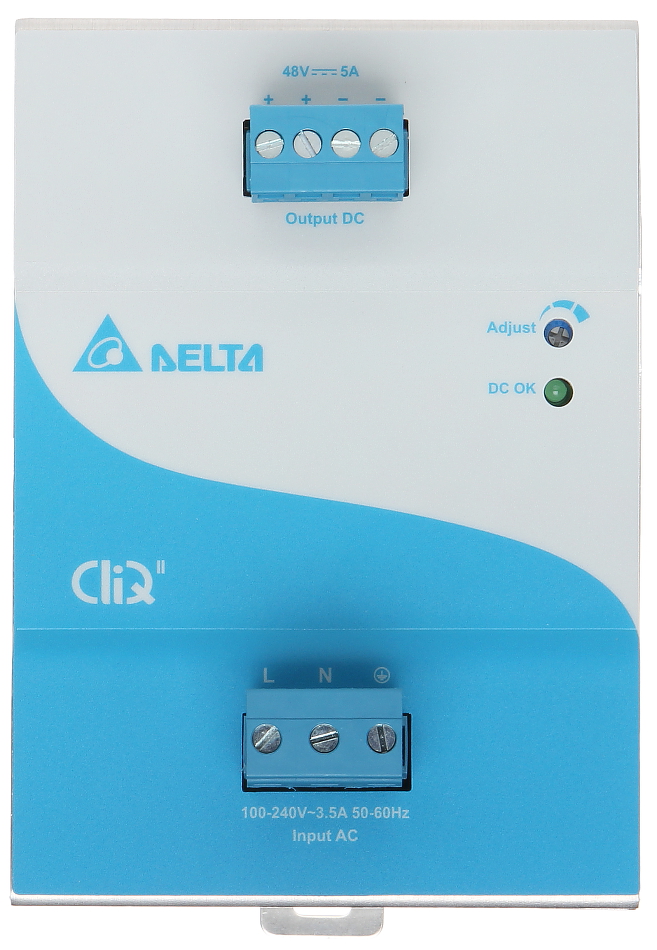 Napięcie wyjściowe: 48 V DC ; Regulacja napięcia wyjściowego: 48 … 56 V ; Wydajność prądowa zasilacza: 5 A ; Moc zasilacza: 240 W ;
