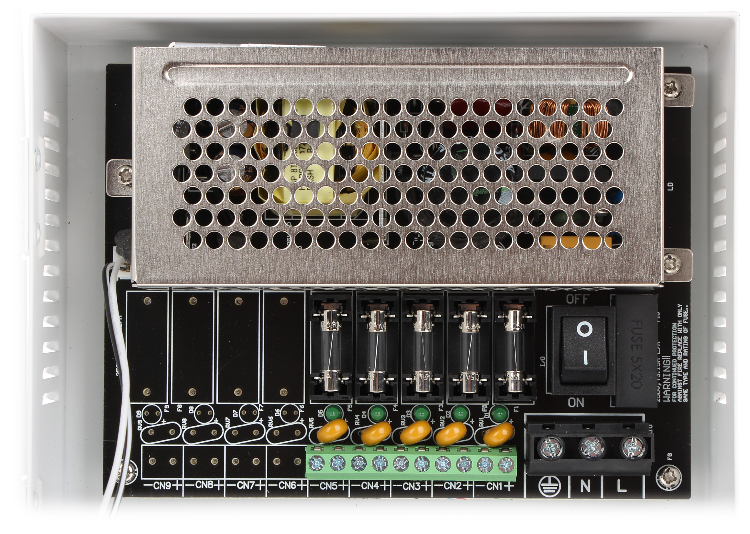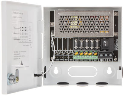 Rodzaj zasilacza: Impulsowy ; Napięcie wyjściowe: 12 V DC ; Wydajność prądowa (łączna): 5 A ; Zabezpieczenie wyjść: 3.15 A Bezpiecznik topikowy ; Napięcie wejściowe: 90 … 264 V ; Liczba wyjść: 9 ;