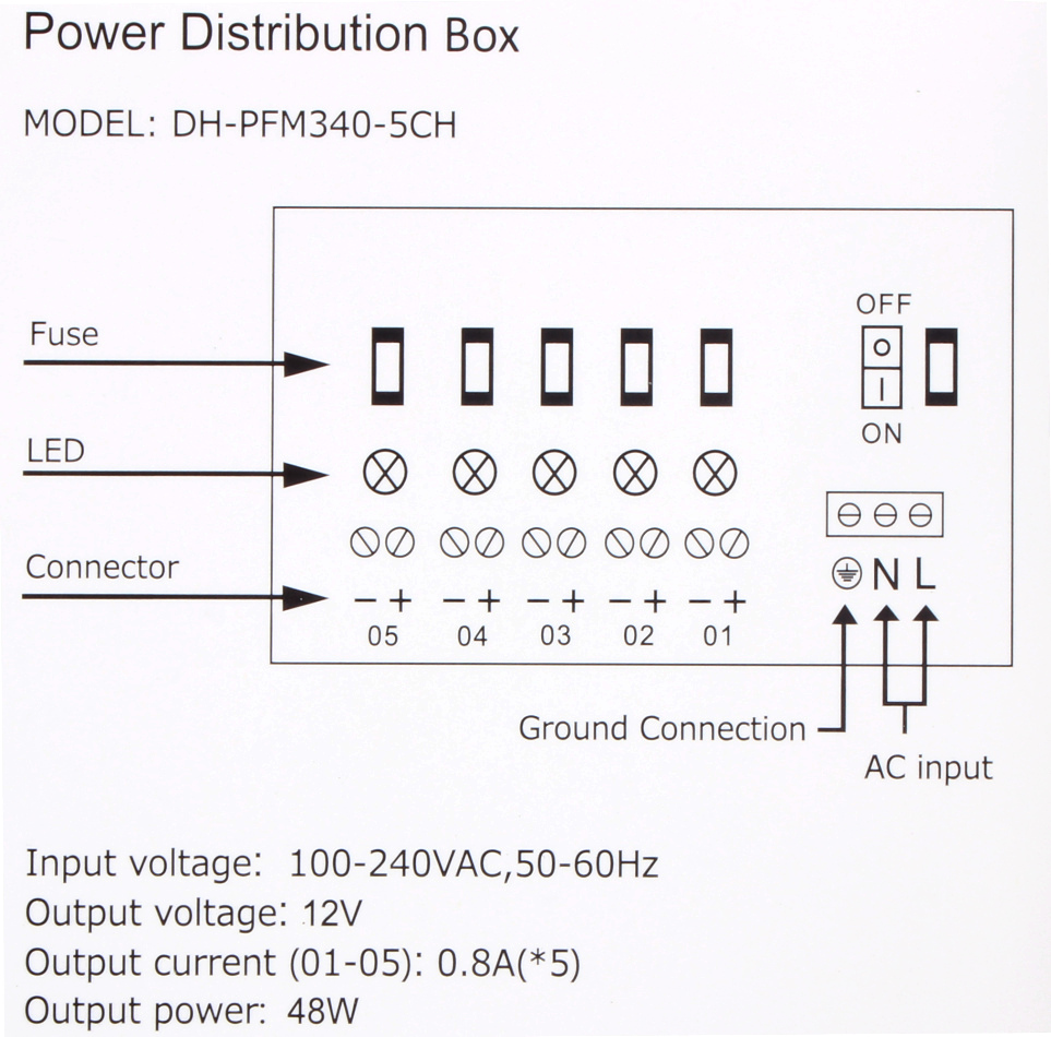 Rodzaj zasilacza: Impulsowy ; Napięcie wyjściowe: 12 V DC ; Wydajność prądowa (łączna): 4 A ; Zabezpieczenie wyjść: 2.5 A Bezpiecznik topikowy ; Napięcie wejściowe: 90 … 264 V ; Liczba wyjść: 5 ;