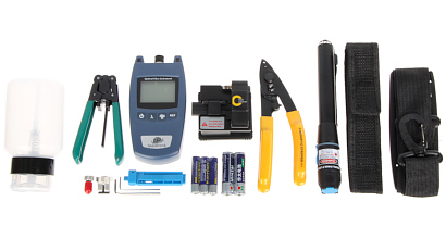 W zestawie: Miernik mocy optycznej, Laserowy tester światłowodów, Stripper do płaskich kabli światłowodowych, Uniwersalny stripper do włókien, Obcinarka światłowodowa, Pojemnik na alkohol izopropylowy z praktycznym dozownikiem, Miarka do pomiaru średnicy włókien światłowodowych ; Wybrane cechy: Możliwość przygotowania wszystkich powszechnie stosowanych typów włókien do wykonania spawu ;