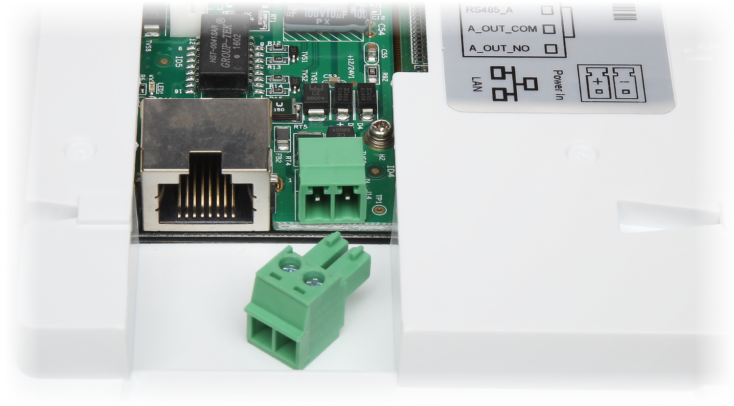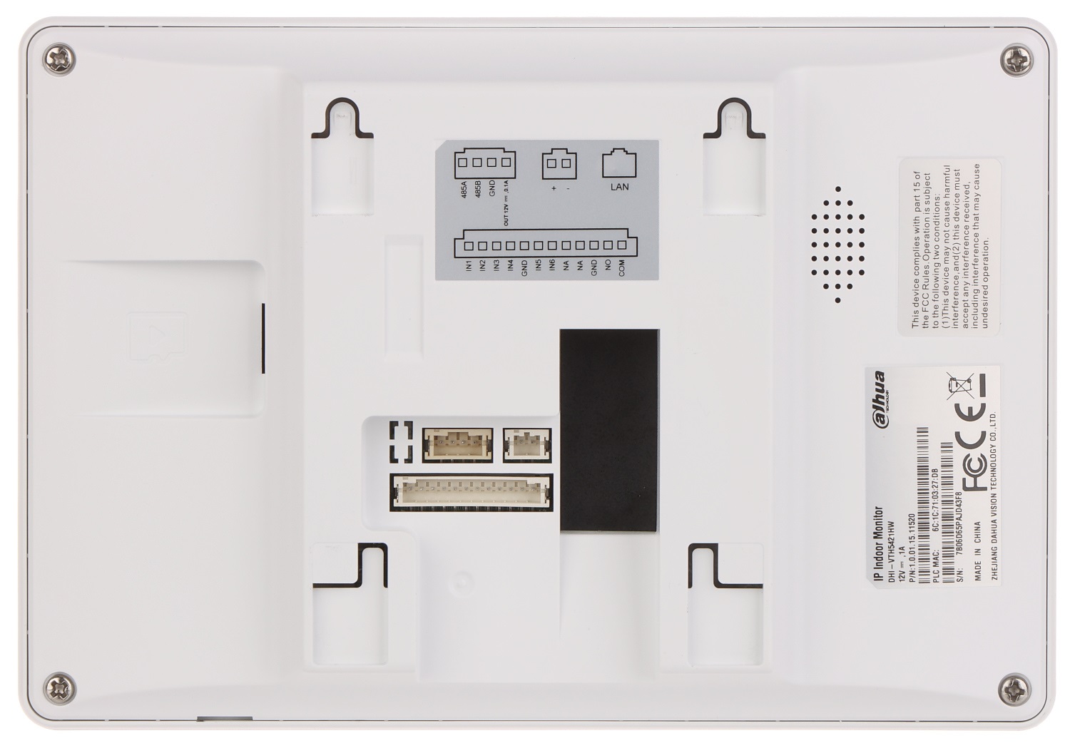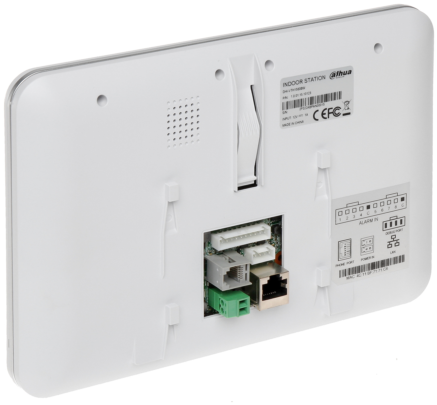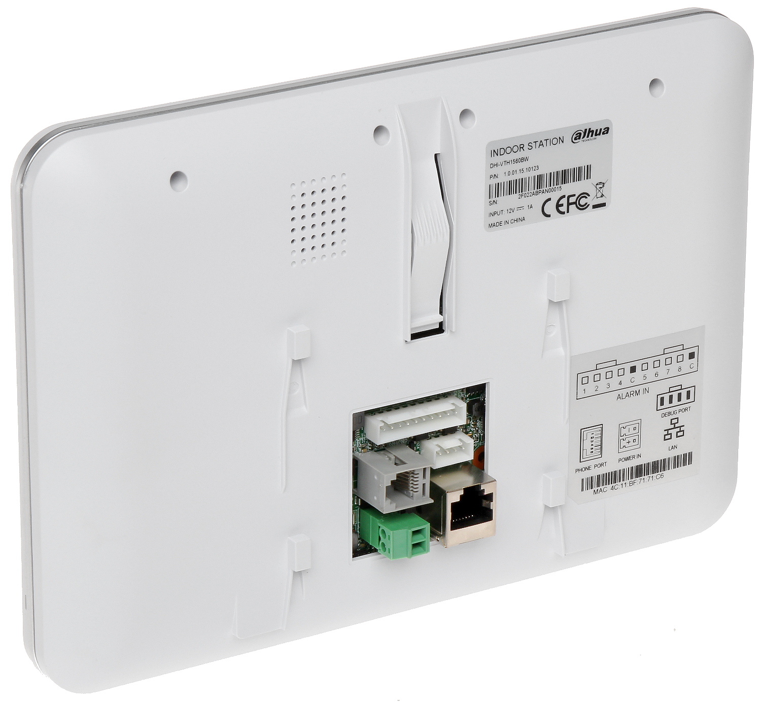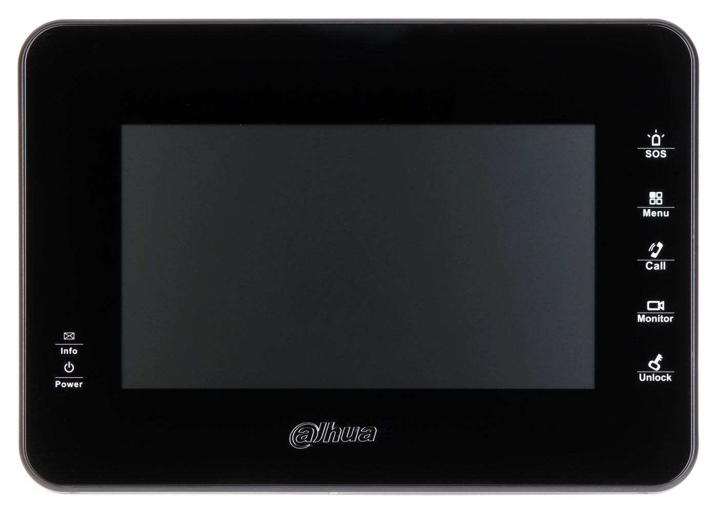 Kąt widzenia: 139 ° ; Oświetlacz IR; Wybrane cechy: Wykrywanie sabotażu – oderwania od podłoża ; Zasilanie: PoE (802.3af), 24 V DC ; Ekran: 7 ” pojemnościowy ekran dotykowy ; Rozdzielczość: 1024 x 600 ; Gniazdo karty pamięci: Obsługa kart Micro SD do 64GB (możliwy zapis lokalny) ; Wybrane funkcje: Szkło hartowane 2.5D, Odbieranie i wyświetlanie informacji publikowanych z centrum zarządzania, Możliwość rejestracji krótkiej wiadomości wideo w przypadku braku odpowiedzi na przycisk dzwonka ; Wejścia alarmowe: 6 ; Wyjścia alarmowe: 1 ; Zasilanie: PoE (802.3af), 12 V DC ;