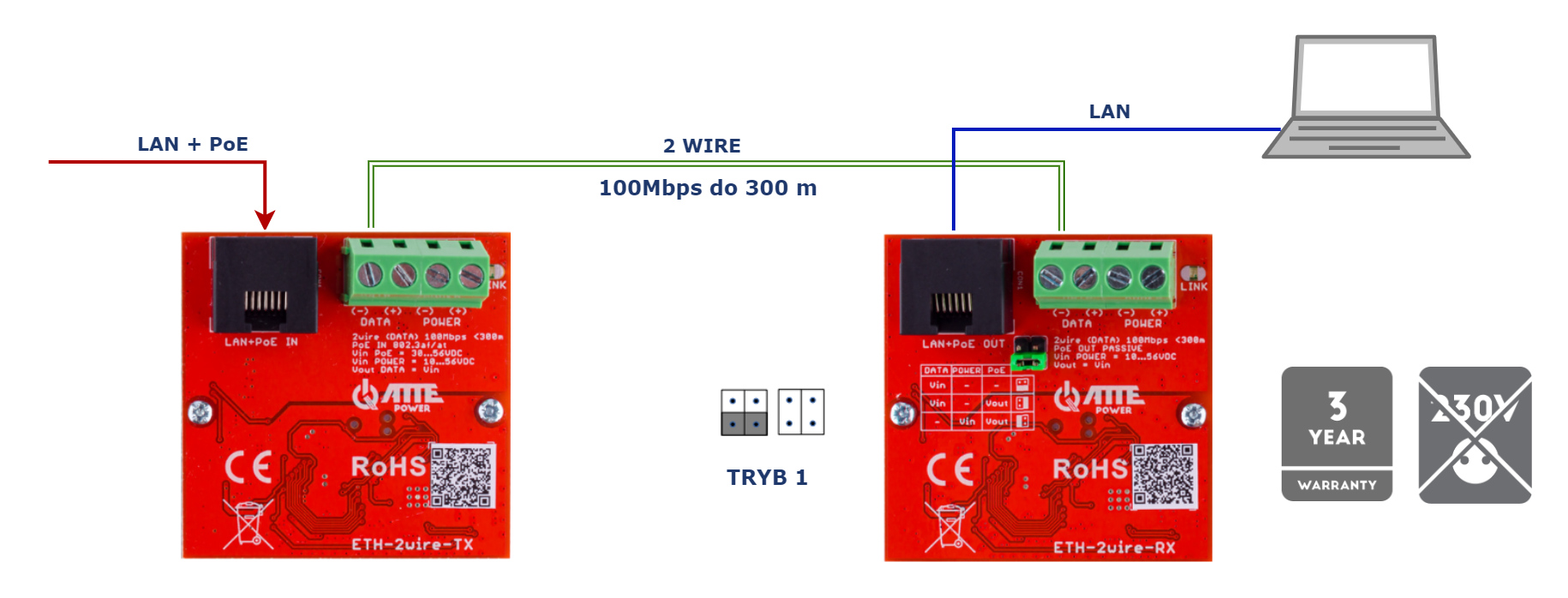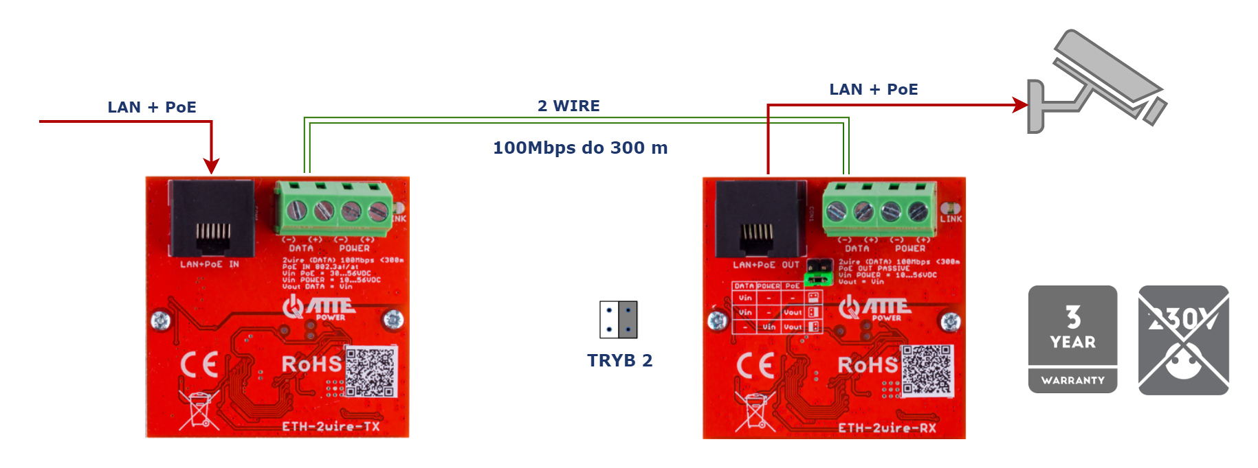 Szybkość transmisji: 100 Mbps ; Zasięg transmisji: 300 m @ 2-wire : UTP, 100 m @ 2-wire : OMY-2X0.75 ;
