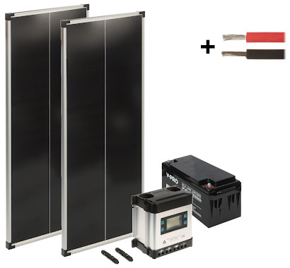 W zestawie: 2 panele fotowoltaiczne 100 W, Akumulator 65 Ah, Regulator solarny ładowania akumulatorów – 20 A, MPPT, Przewody połączeniowe : 2 x 10 m, Złącza MC4 – 2 szt. ; Teoretyczna dzienna produkcja energii (dla Polski): 540 Wh ;
