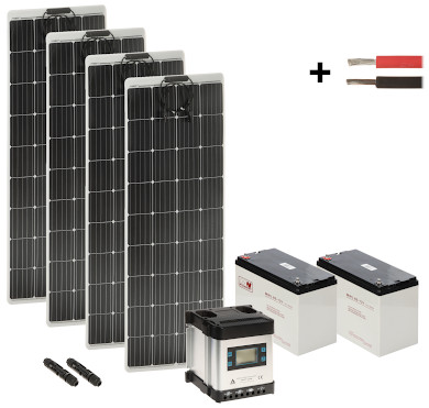 W zestawie: 4 panele fotowoltaiczne 160 W, 2 akumulatory 80 Ah, Regulator solarny ładowania akumulatorów – 20 A, MPPT, Przewody połączeniowe : 2 x 10 m, Złącza MC4 – 2 szt. ; Teoretyczna dzienna produkcja energii (dla Polski): 1730 Wh ;