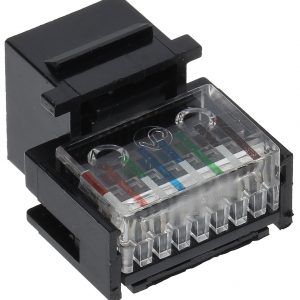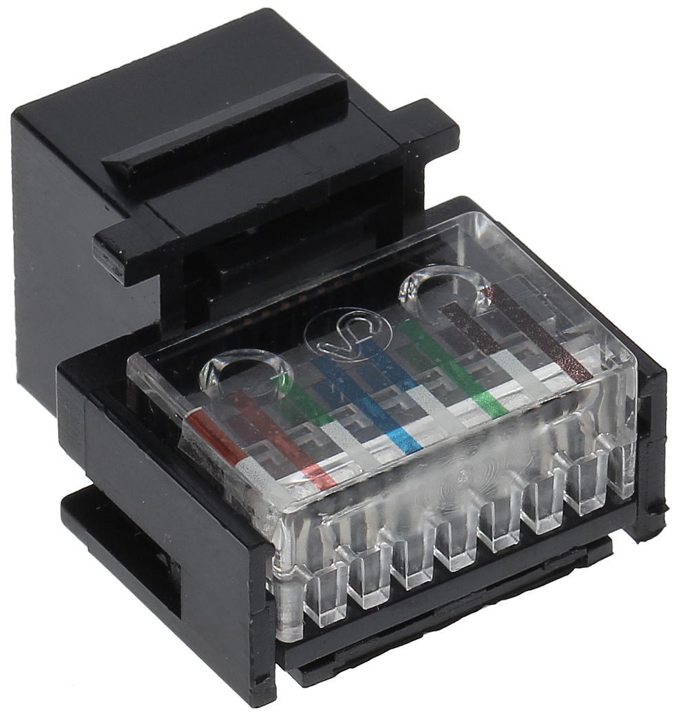 Rodzaj złącza: Gniazdo RJ45 ; Kolor: Czarny ; Mocowanie żyły: Mocowanie od spodu (kątowe), zatrzaskowe ; Przeznaczenie: Patch panel Keystone, UTP kat. 5e ;