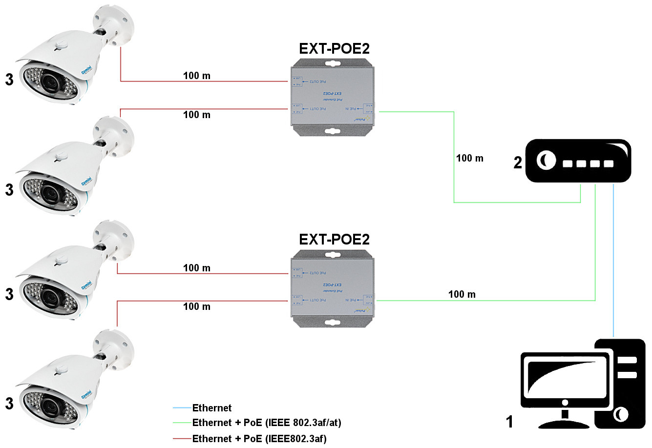 EXT-POE4 pozwala na zwiększenie odległości przesyłu zasilania PoE oraz danych za pomocą skrętki UTP kategorii 5e do maks. 200 m