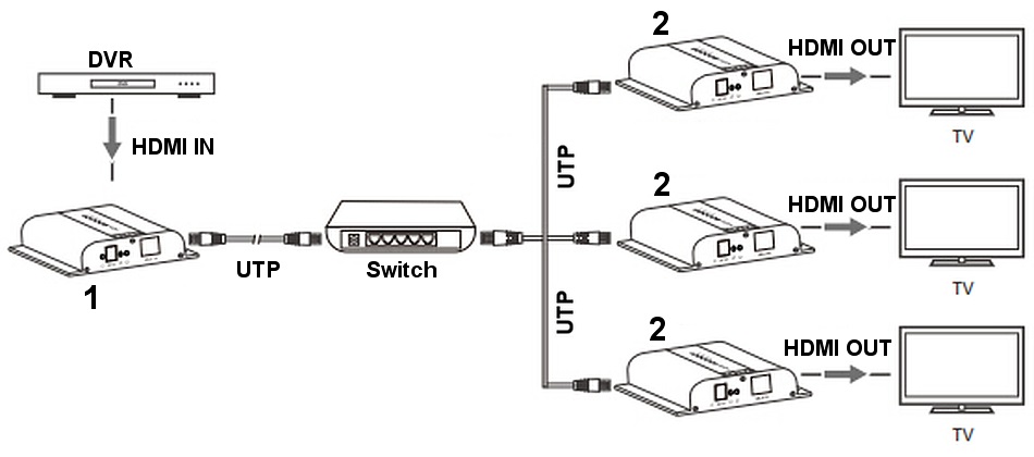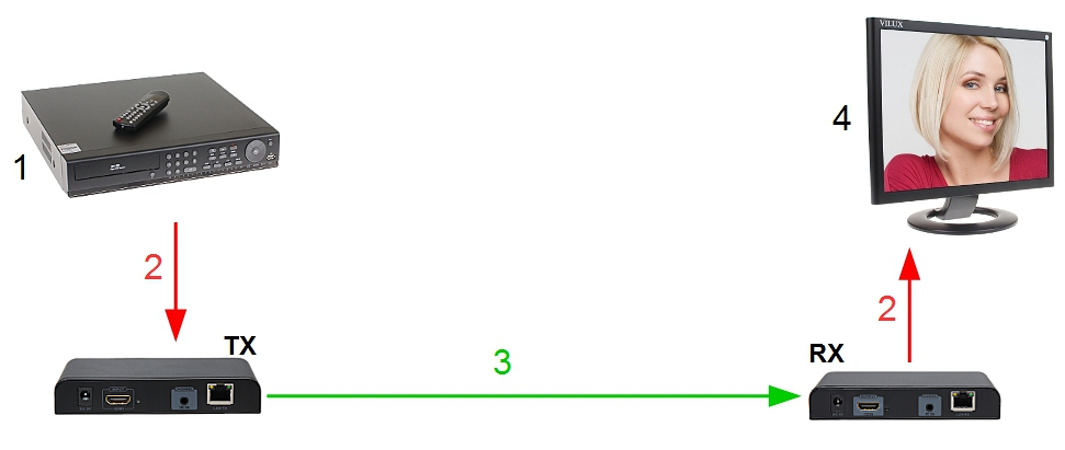 Urządzenie umożliwia przesył sygnału wysokiej rozdzielczości do odbiornika telewizyjnego wyposażonego w złącze HDMI poprzez skrętkę komputerową kat. 5, 5e, 6