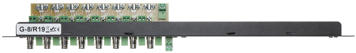 G-8/R19 jest urządzeniem przeznaczonym do wygodnego połączenia 8 przewodów telewizji przemysłowej typu YAP oraz uporządkowanym rozgałęzieniu zasilania z jednego zasilacza większej mocy.