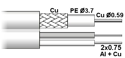 | Żyła wewnętrzna: | Ø 0.59 mm Cu – Drut |
