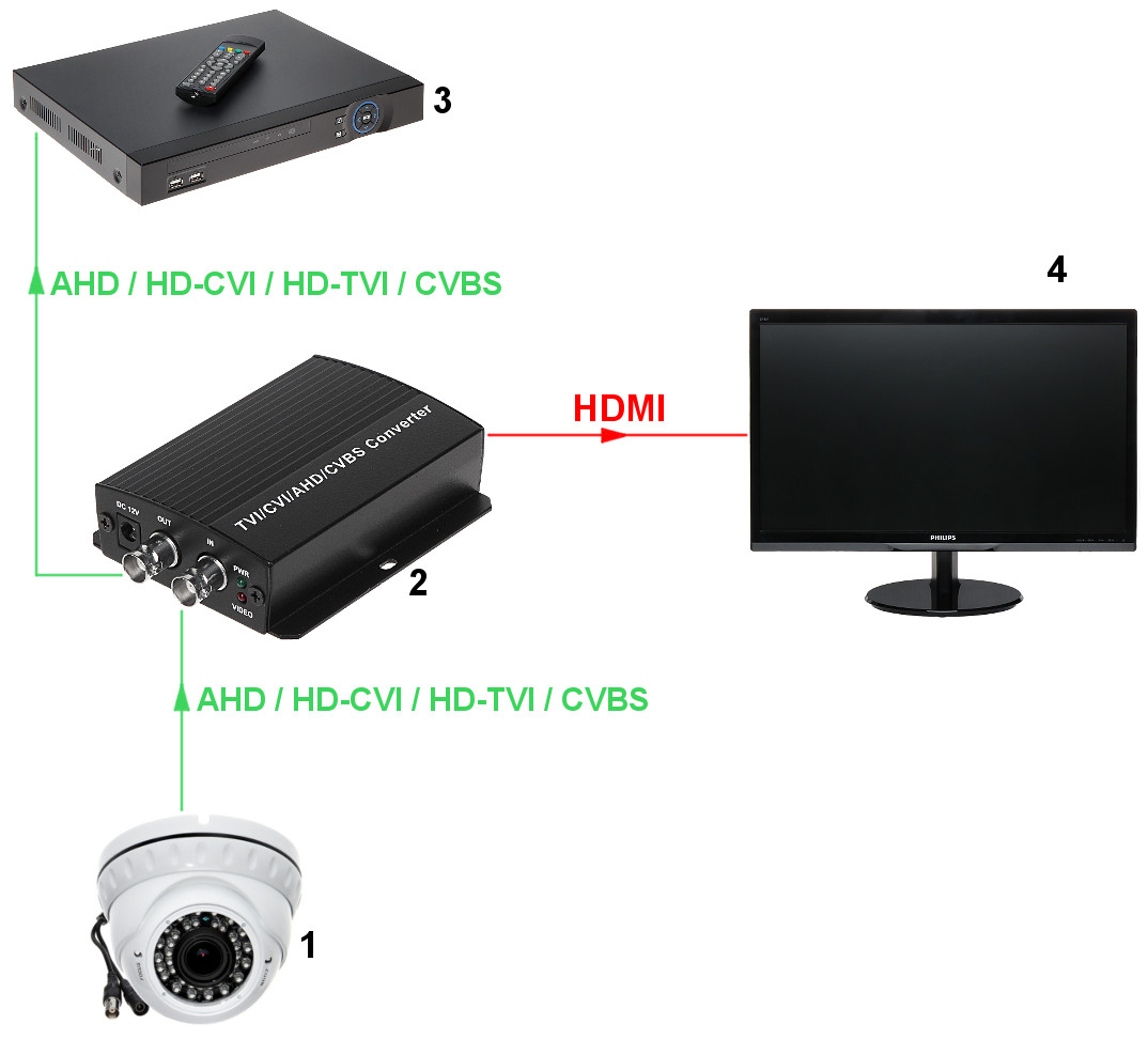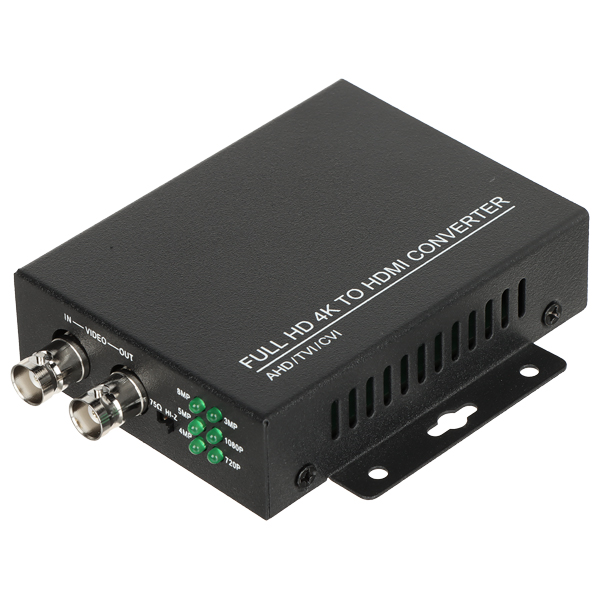 Konwerter HV/HDMI+HV umożliwia podłączenie sygnału AHD/HD-CVI/HD-TVI/CVBS do zwykłego monitora lub projektora z wejściem HDMI.