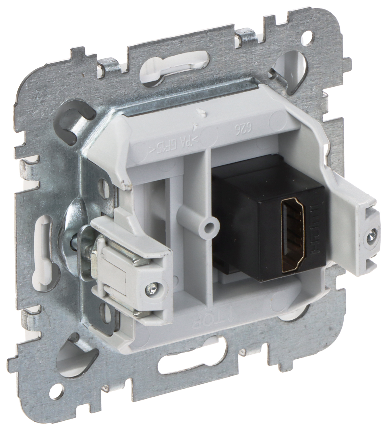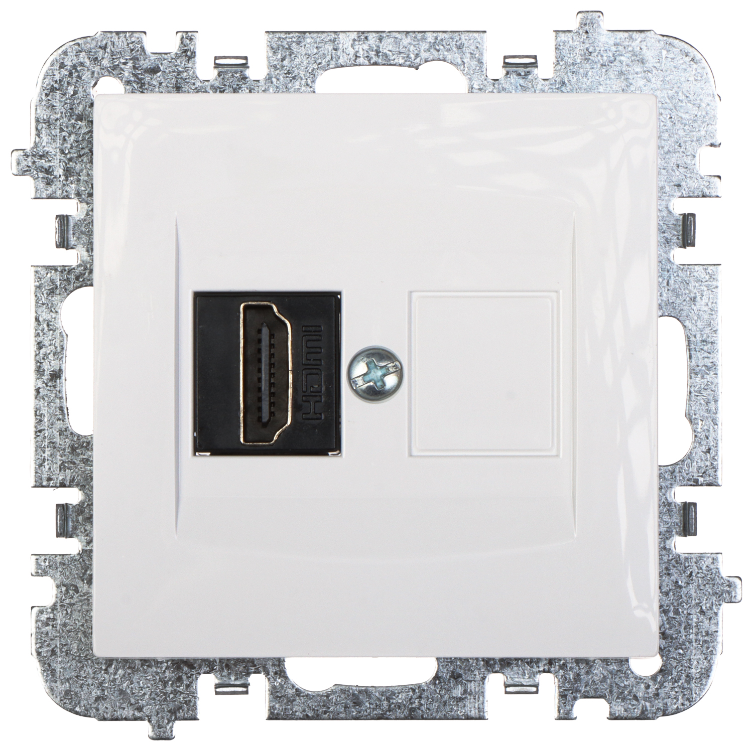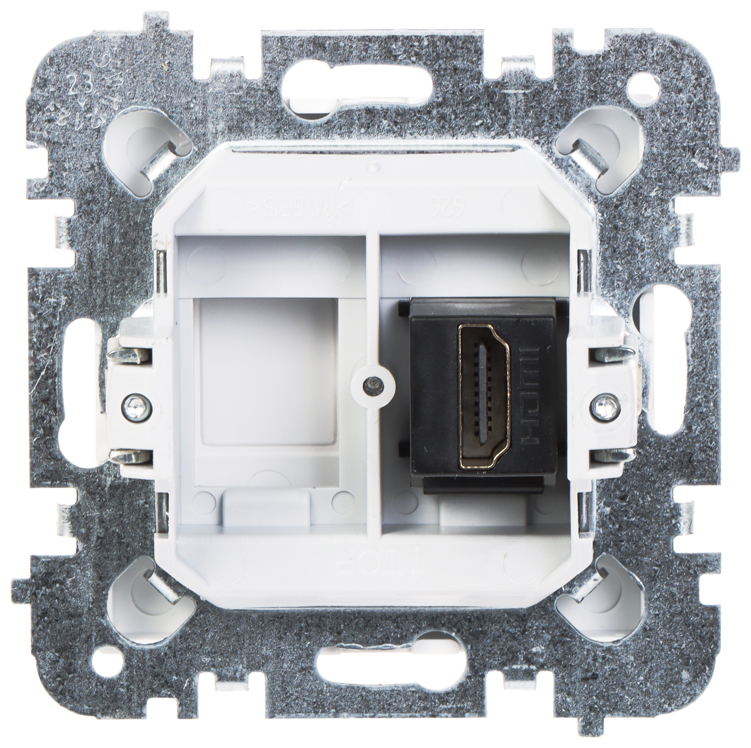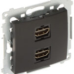 Podwójne gniazdo HDMI odpowiednie do mocowania na puszce podtynkowej.