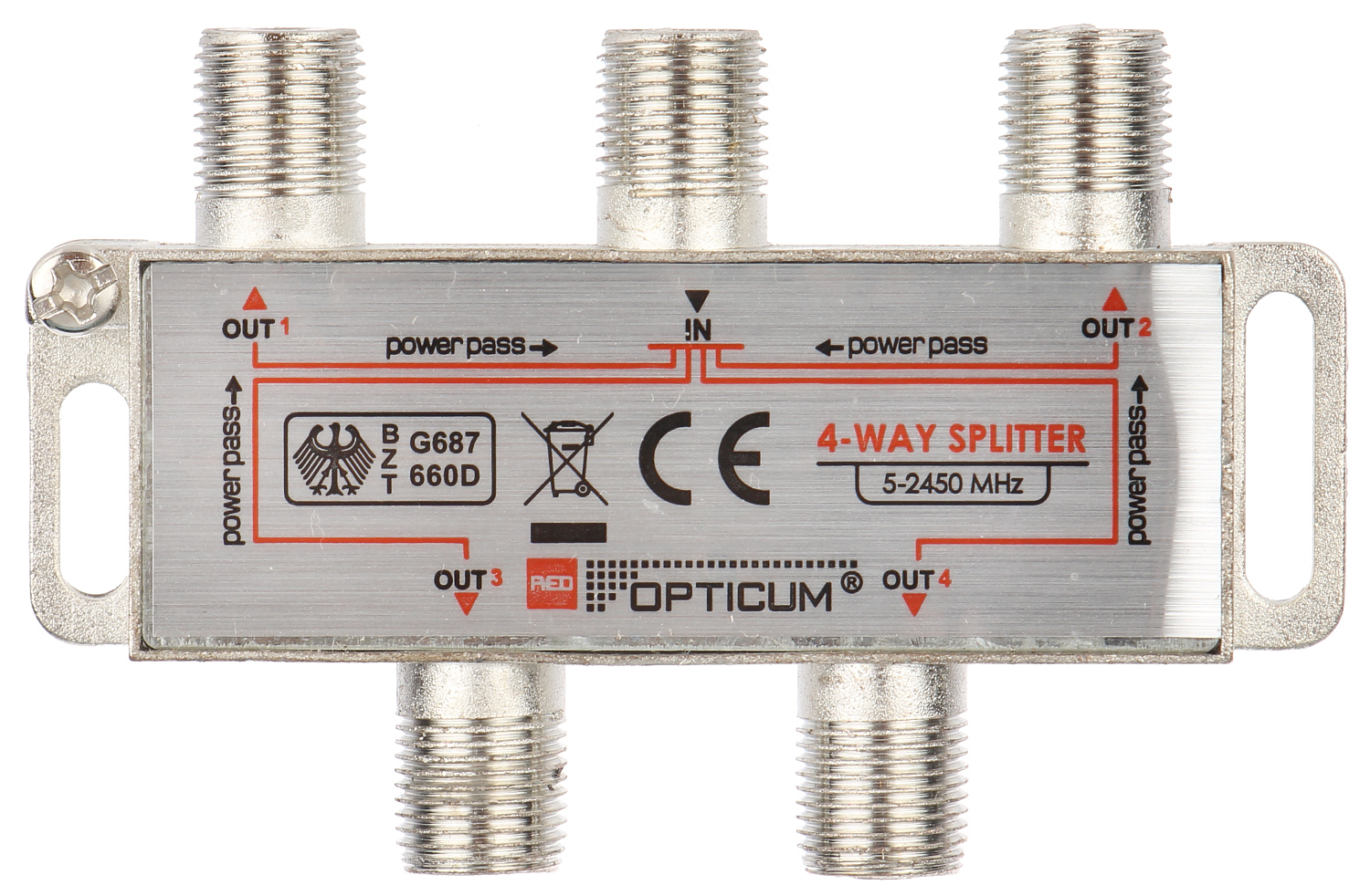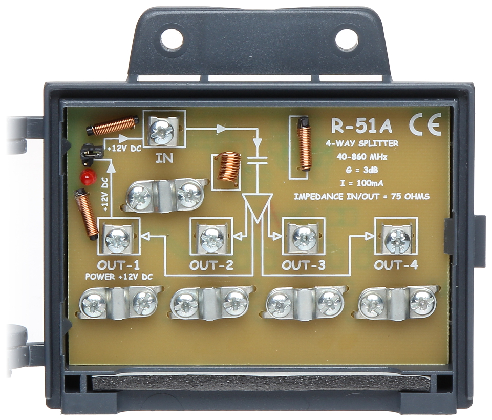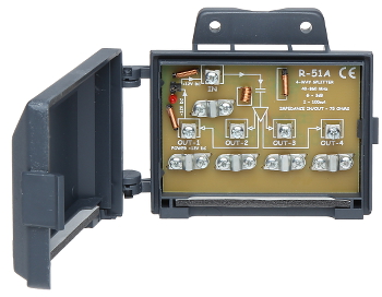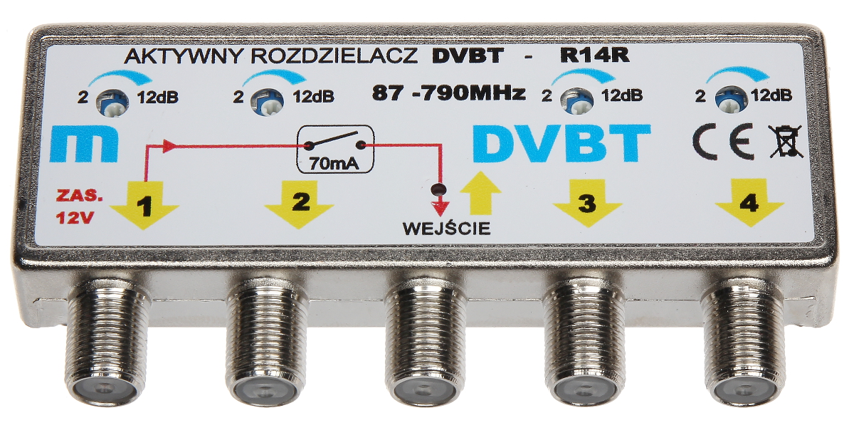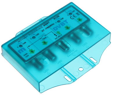 Aktywny rozgałęźnik z regulacją wzmocnienia; Liczba wejść: 1 szt. ; Liczba wyjść: 4 szt. ; Zakres częstotliwości: 87 … 790 MHz ; Wzmocnienie : 4 x 2 … 12 dB ; Maks. poziom sygnału TV: 88 dBµV ; Możliwość podania napięcia na przedwzmacniacz; Ekranowanie;