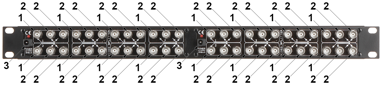 Odpowiednie odległości pomiędzy gniazdami, umożliwiają swobodne dokręcenie palcami dowolnego wtyku BNC