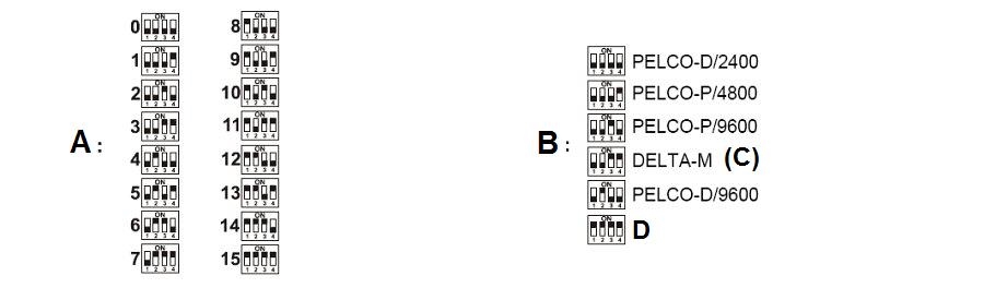 | Dostępne protokoły: | Pelco-D, Pelco-P, Delta-M |