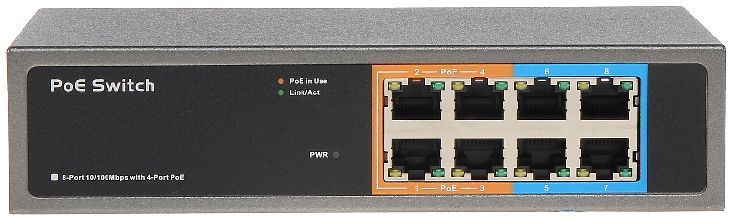 | Szybkość transmisji: | 10 / 100 Mb/s : 4 Porty LAN + 4 Porty LAN & PoE |