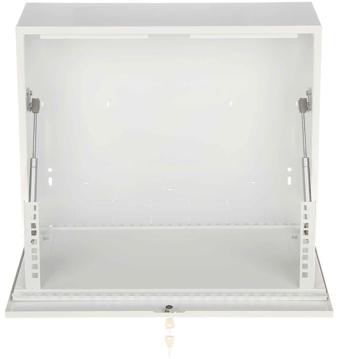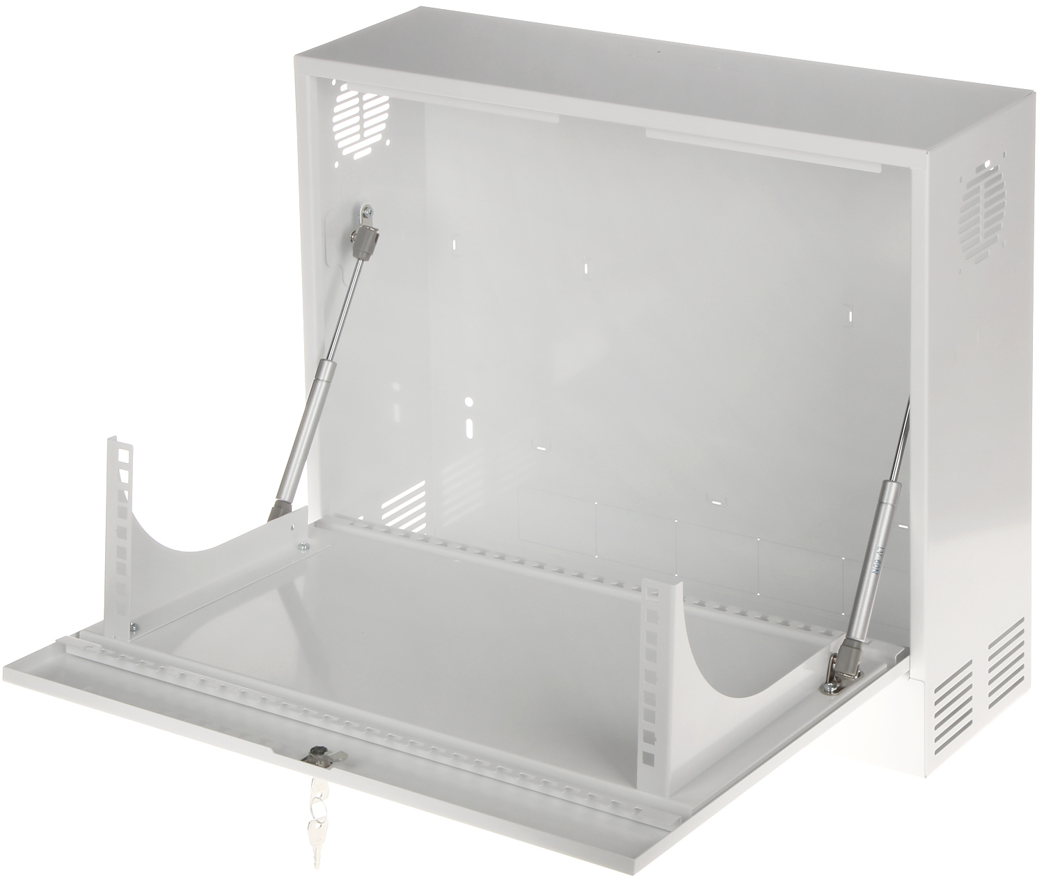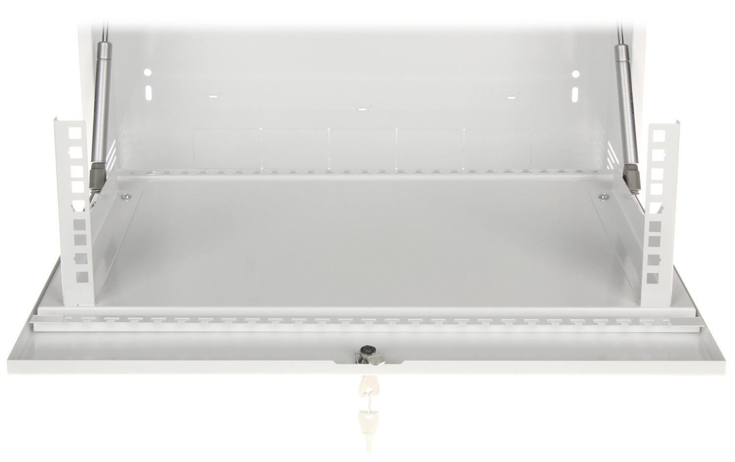 Zastosowane w szafie siłowniki spowalniają proces otwierania przedniej pokrywy, na której znajdują się szyny do montażu urządzeń