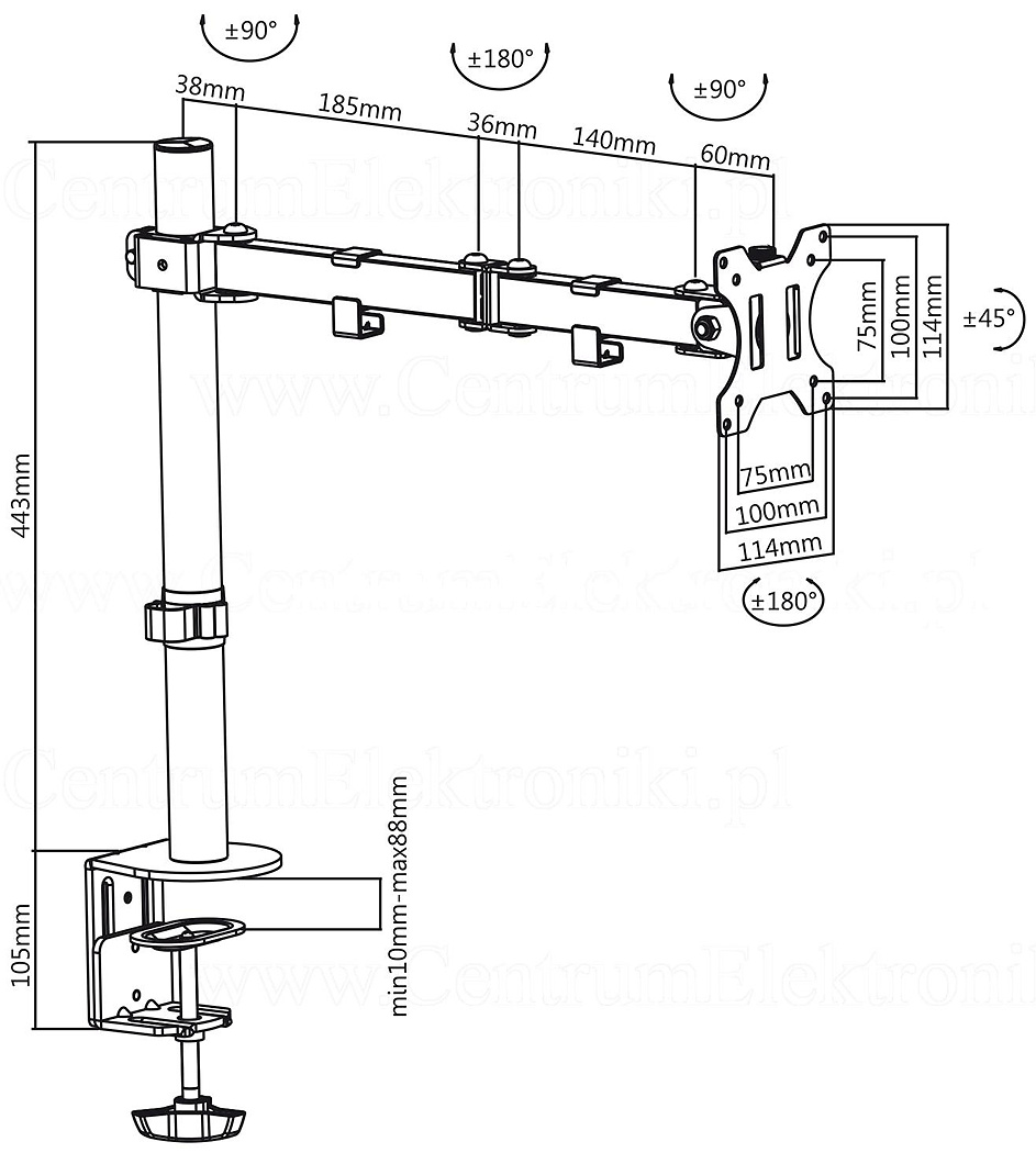 | Obrót w poziomie: | Regulowany na dwóch przegubach w zakresie -90 ° … 90 ° każdy |