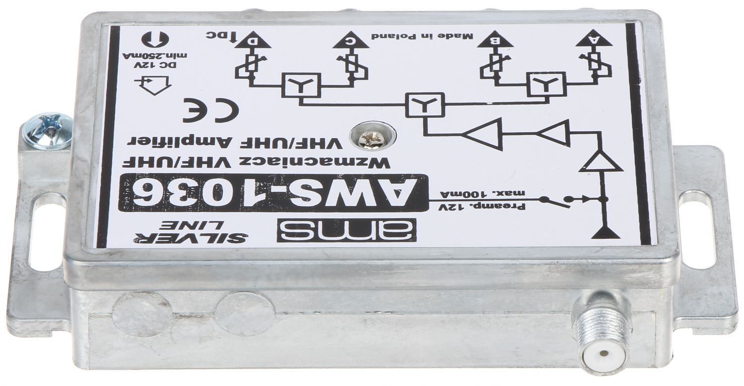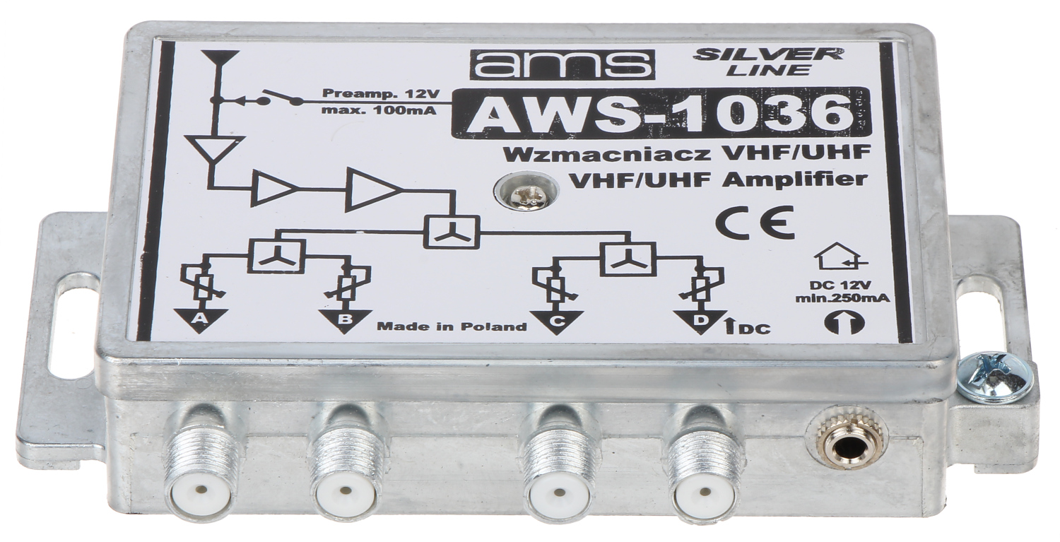 AWS-1036 przeznaczony jest do wzmocnienia i podziału sygnału TV na 4 domowe instalacje antenowe zbudowane z zastosowaniem anten pasmowych połączonych zwrotnicą.