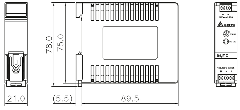 Zasilacz impulsowy instalowany na szynie TS35/7.5 lub 15 DIN, odporny na wysokie temperatury pracy (do 70°C).