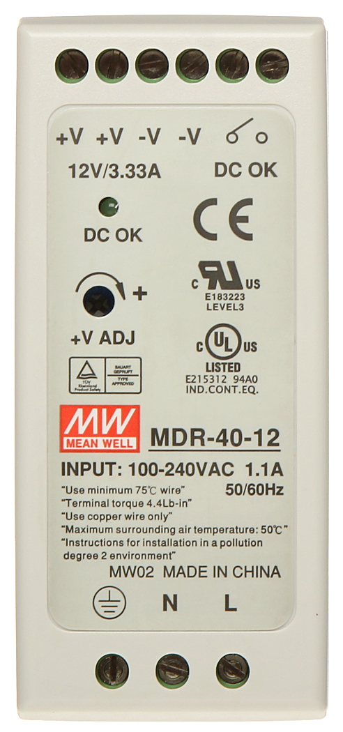 Zasilacz impulsowy instalowany na szynie TS35/7.5 lub 15 DIN, odporny na wysokie temperatury pracy (do 70°C)