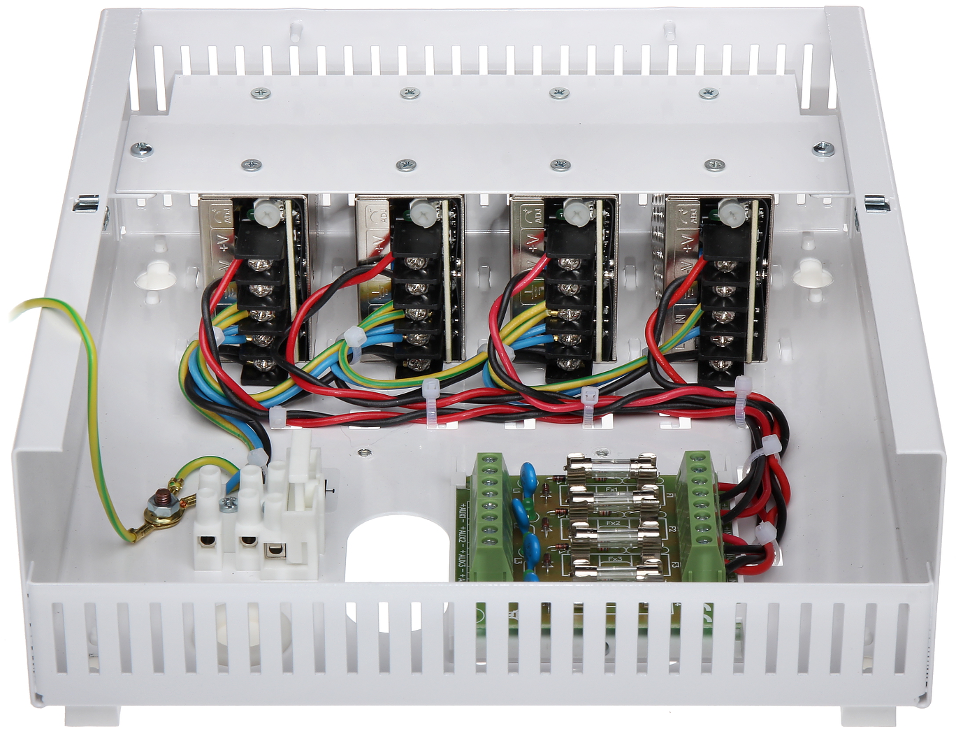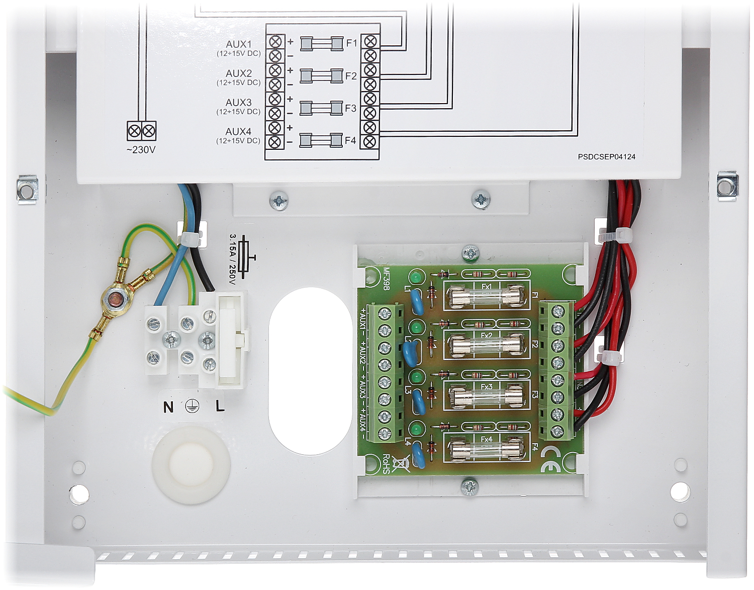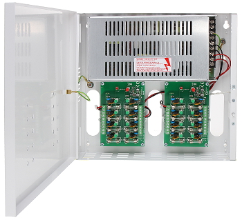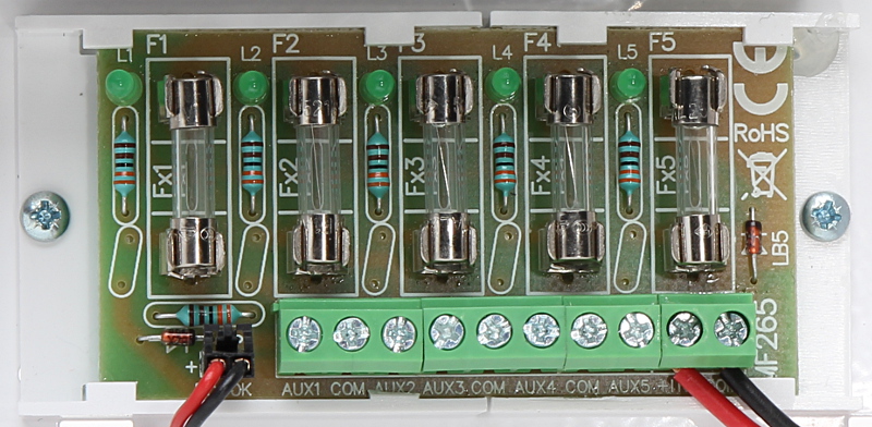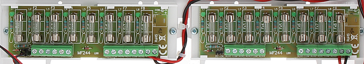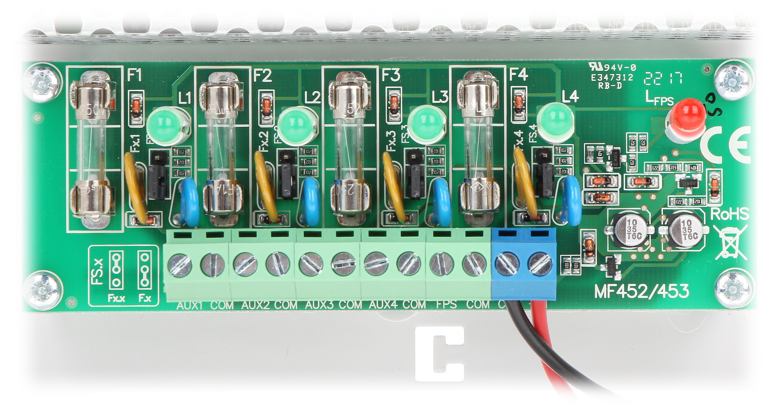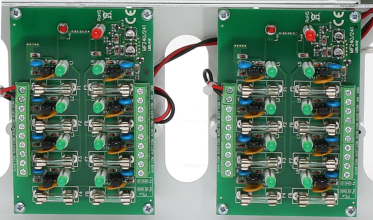 Każde wyjście zabezpieczone jest niezależnie bezpiecznikiem topikowym lub polimerowym PTC (wybór zworką).