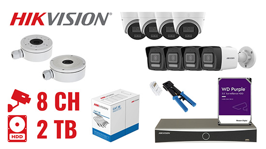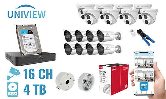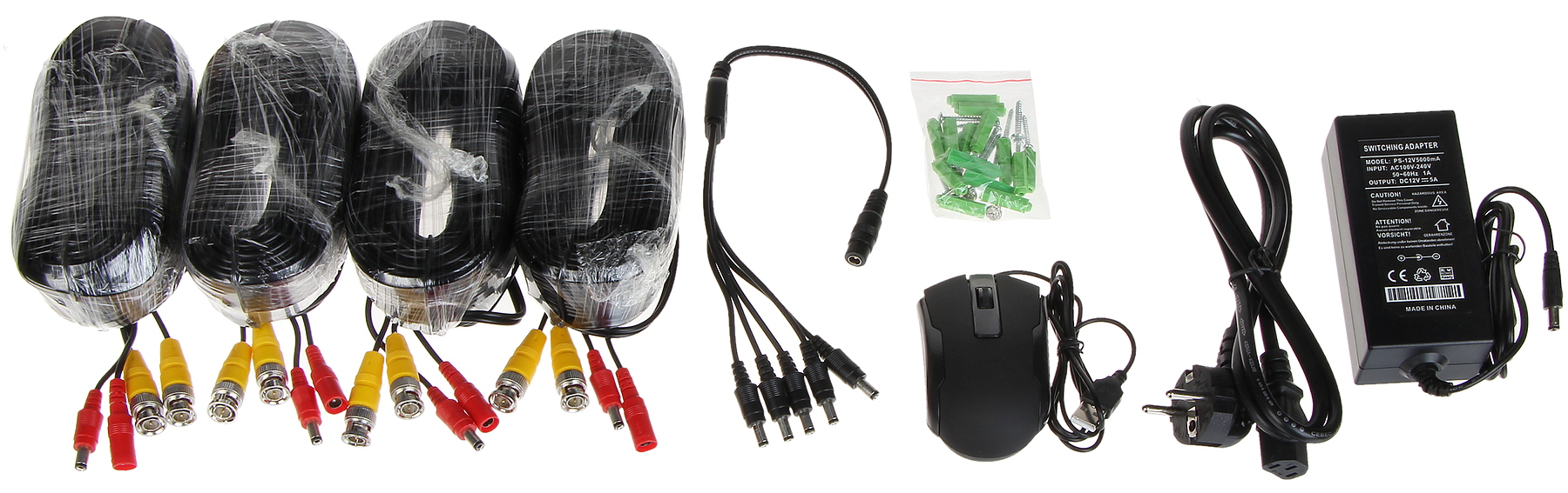 Zestaw do monitoringu składa się z 4 kamer, rejestratora z dyskiem twardym Seagate 1TB, zasilacza DC 12V/5A oraz 4 przewodów połączeniowych o długości 18 m każdy.