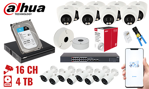 Zestaw do monitoringu składa się z 4 kamer, rejestratora Wi-Fi z dyskiem twardym Western Digital 1TB, oraz 4 zasilaczy DC 12V / 1.5 A do niezależnego zasilania kamer.