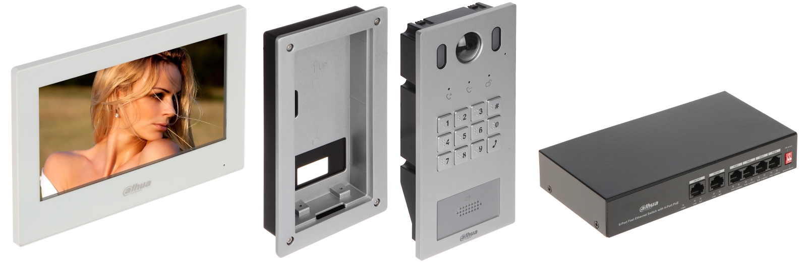 Zestaw wideodomofonowy IP z 7 calowym dotykowym monitorem, możliwością integracji alarmu oraz obsługi 2 wejść, a także zdalnym interkomem z aplikacji mobilnej.